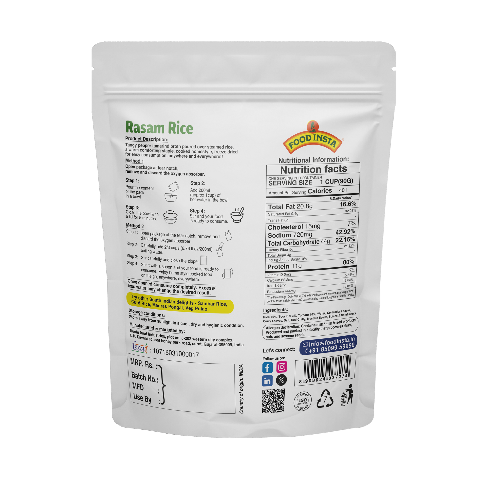 Each Food Insta pack weighs 90g in its compact form, making it ideal as travel food. Once heated and expanded, it transforms into a filling 250g meal, perfect for satisfying hunger on the go.
